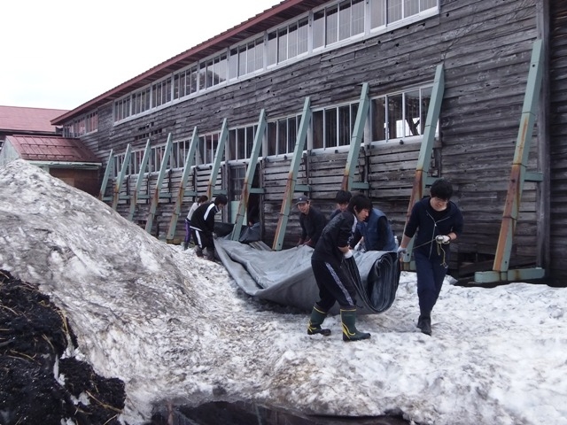 これからの気温の上昇に備え、断熱材やシートを雪山に掛けました。